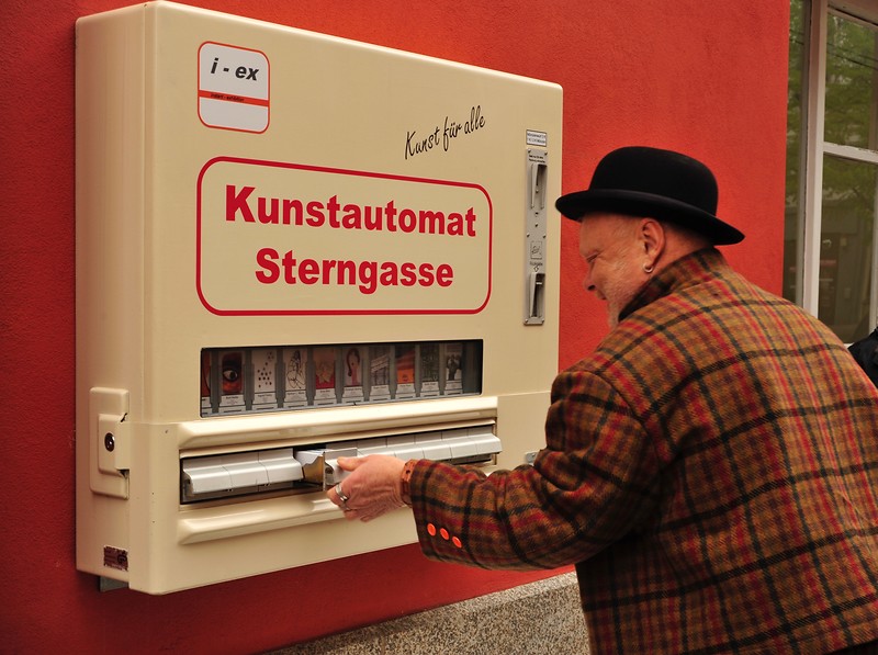 Der Kunstautomat Sterngasse bietet Kunst in limitierter Auflage zu günstigen Preisen. Kunst im Format einer Zigarettenschachtel zum Preis von 5,--€.